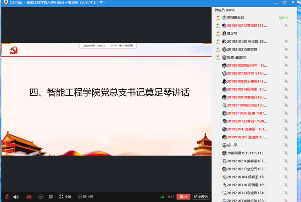 本次入党积极分子培训充分运用QQ群、腾讯课堂、学习通等网络平台,以线上视频教学为主,以疫情防控为教科书,通过集中讲党课、小组学习、分组讨论、观看影片、自学研读、实践活动等方式进行。此次培训,使入党积极分子深入学习了党的基本理论,明确了新时期共产党员的标准和肩负的历史使命,进一步坚定了理想信念,激发了锻造过硬知识技能、报效党和国家的热情和动力。