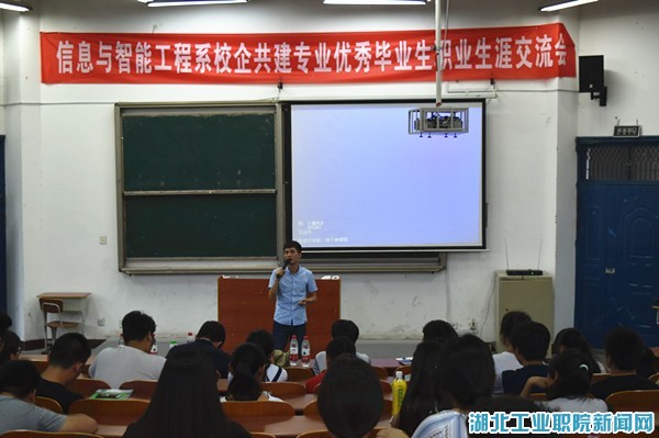 新闻网讯(学生记者 张新)“我们从这里起航,走向遥远的地方。当我们走向明天,又怎能把昨日遗忘……”6月22日晚6:30,信息与智能工程系校企共建专业在4101教室举办首届优秀毕业生交流会。校企共建专业就业办主任肖海霞应邀出席,2013级优秀毕业生及2015级校企共建专业全体学生参与本次交流会。