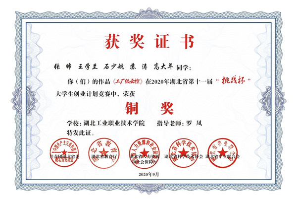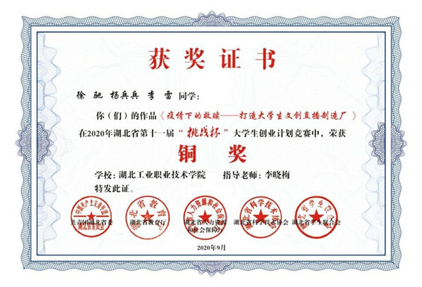 新闻网讯(通讯员李晓梅)近日,第十一届“挑战杯”湖北省大学生创业计划竞赛落下帷幕,欧冠官网双创团队斩获两枚铜奖。欧冠中文官网2018级电气自动化技术专业张帅学生团队项目《工厂级云控》、欧冠中文官网2019级电气自动化技术专业徐驰学生团队项目《疫情下的救赎——打造大学生文创直播制造厂》获大赛铜奖。
