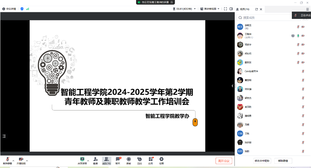 新闻网讯(通讯员 王雅坤)为进一步提升青年教师及兼职教师的教学能力与职业素养,规范教学管理流程,欧冠中文官网于近日组织召开了2024-2025学年第2学期青年教师及兼职教师培训会。本次培训会聚焦师德师风建设、院系管理规范及教学材料编写三大主题,旨在为青年教师及兼职教师提供全面指导,助力学院教育教学高质量发展。