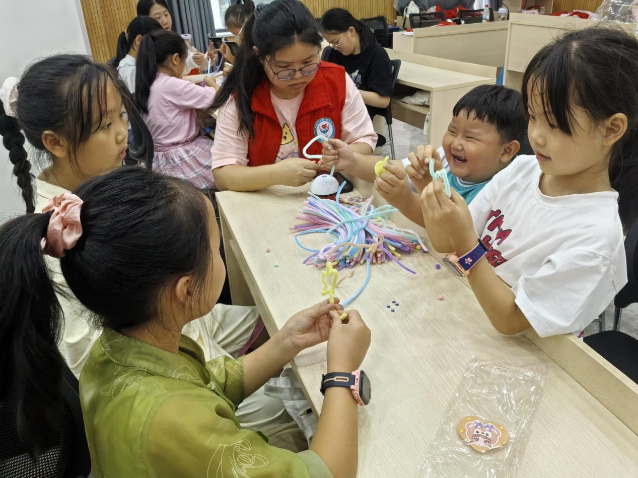 下午的扭扭棒制作活动充满趣味。志愿者们提前准备了五颜六色的扭扭棒,向孩子们展示了花朵、小动物等成品,并详细讲解制作方法和技巧。孩子们兴致勃勃,纷纷拿起扭扭棒动手尝试。有的小朋友跟着志愿者的步骤制作小花朵,有的发挥想象力创作独一无二的小动物,还有的几人一组合作完成复杂造型。志愿者们在一旁巡回指导,及时帮助遇到困难的孩子。活动现场欢声笑语不断,一根根普通的扭扭棒在孩子们手中变成了一件件可爱的作品。通过亲手制作,孩子们的动手能力和创造力得到锻炼,也体会到了手工制作的乐趣。